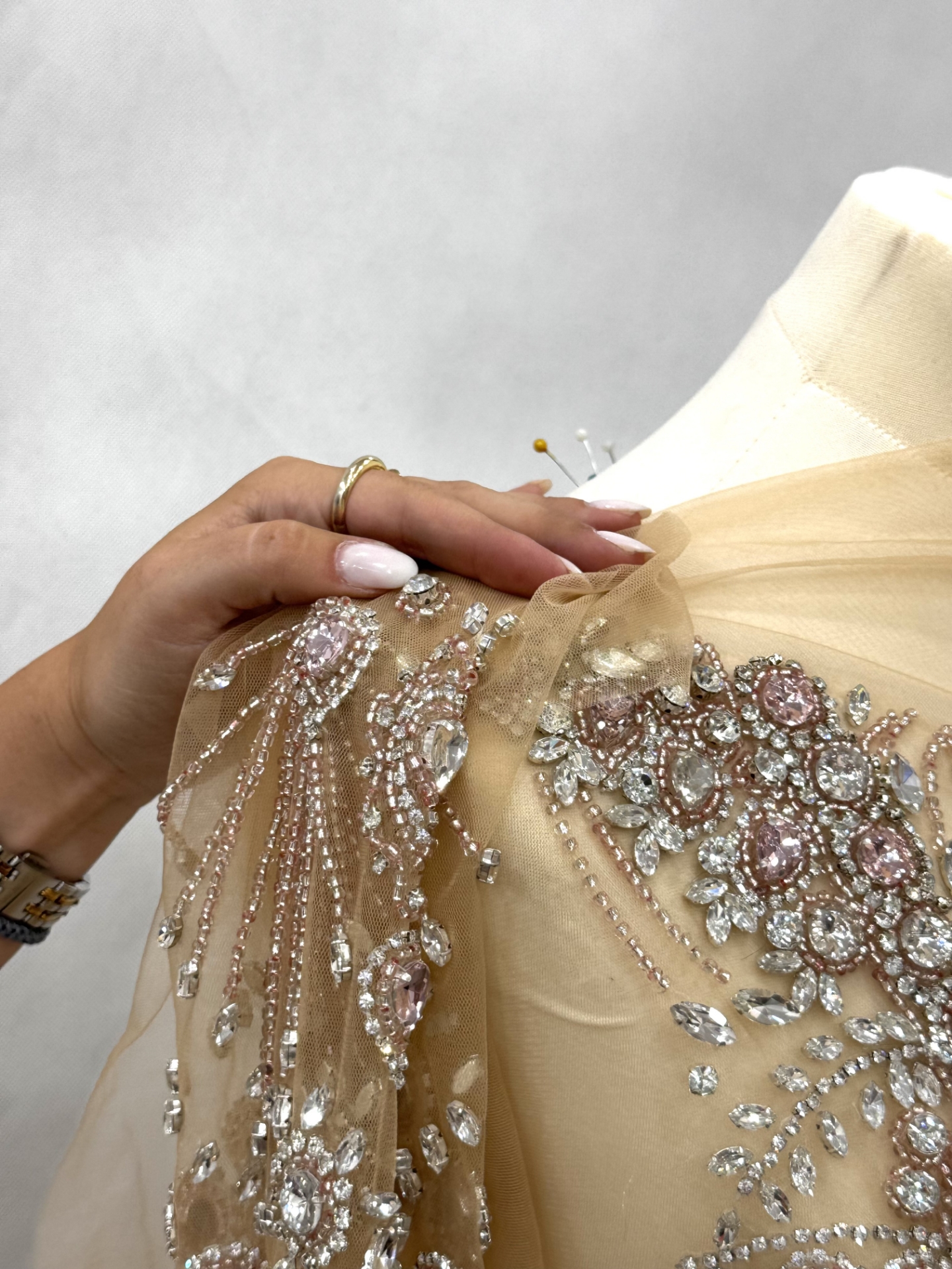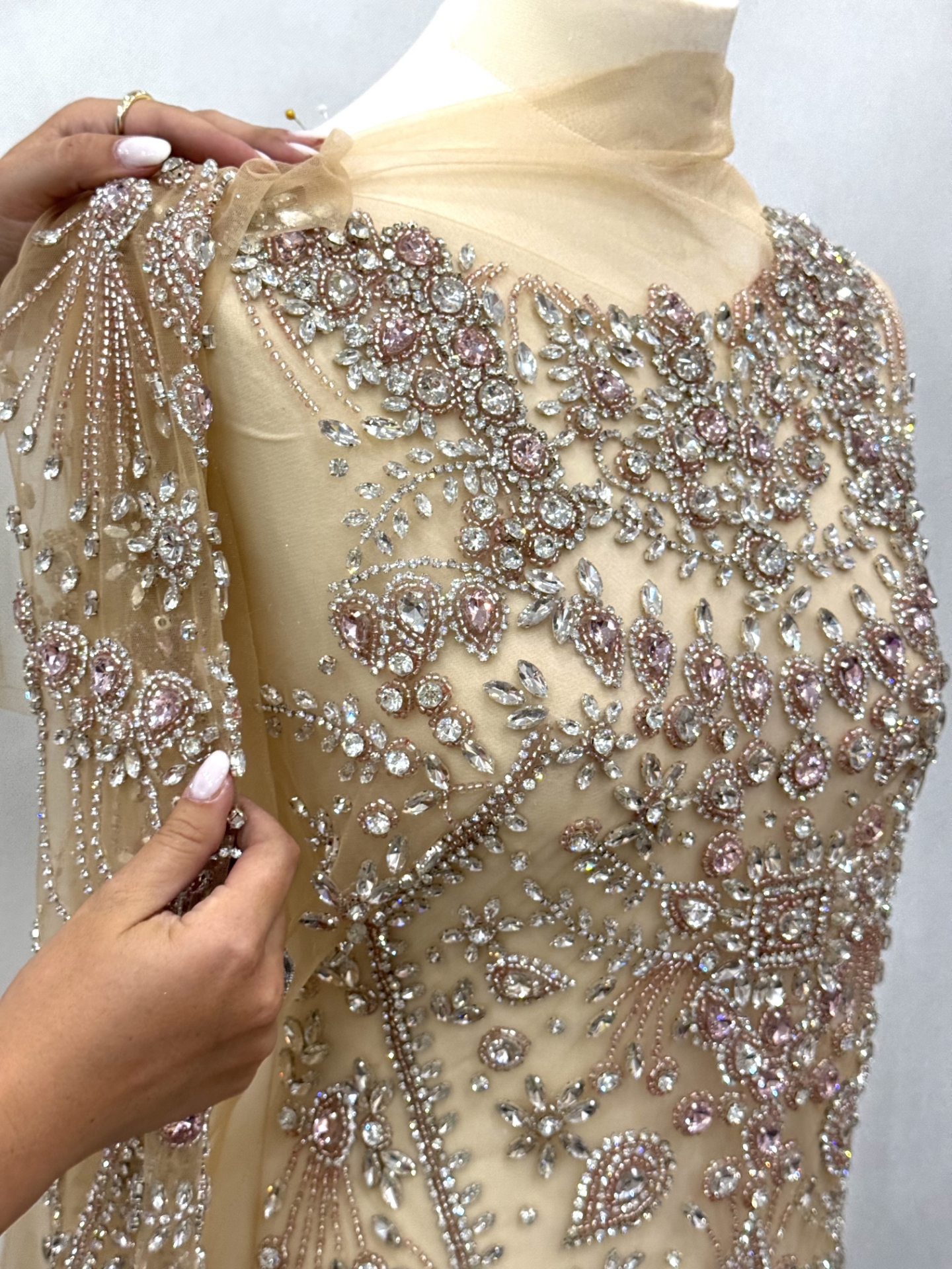 Set de 4 panouri (fata, spate si maneci lungi) lucrate manual cu cristale si margele in nuante de rose si argintiu. Baza tule-ului este usor elastica si este beige.